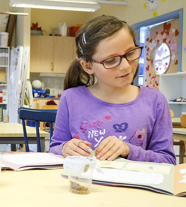 Vid besök i Leonies klass har alla elever fått odla fram egna larver i en burk. Alla är i farten med dokumentation av larvernas utveckling via Ipads. De berättar gärna. Även här blir det tydligt att Leonie är en del i gemenskapen.